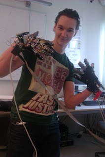 | In het engineering lab, handschoenen om de fancy robot armen te besturen, met dank aan Petar :p |